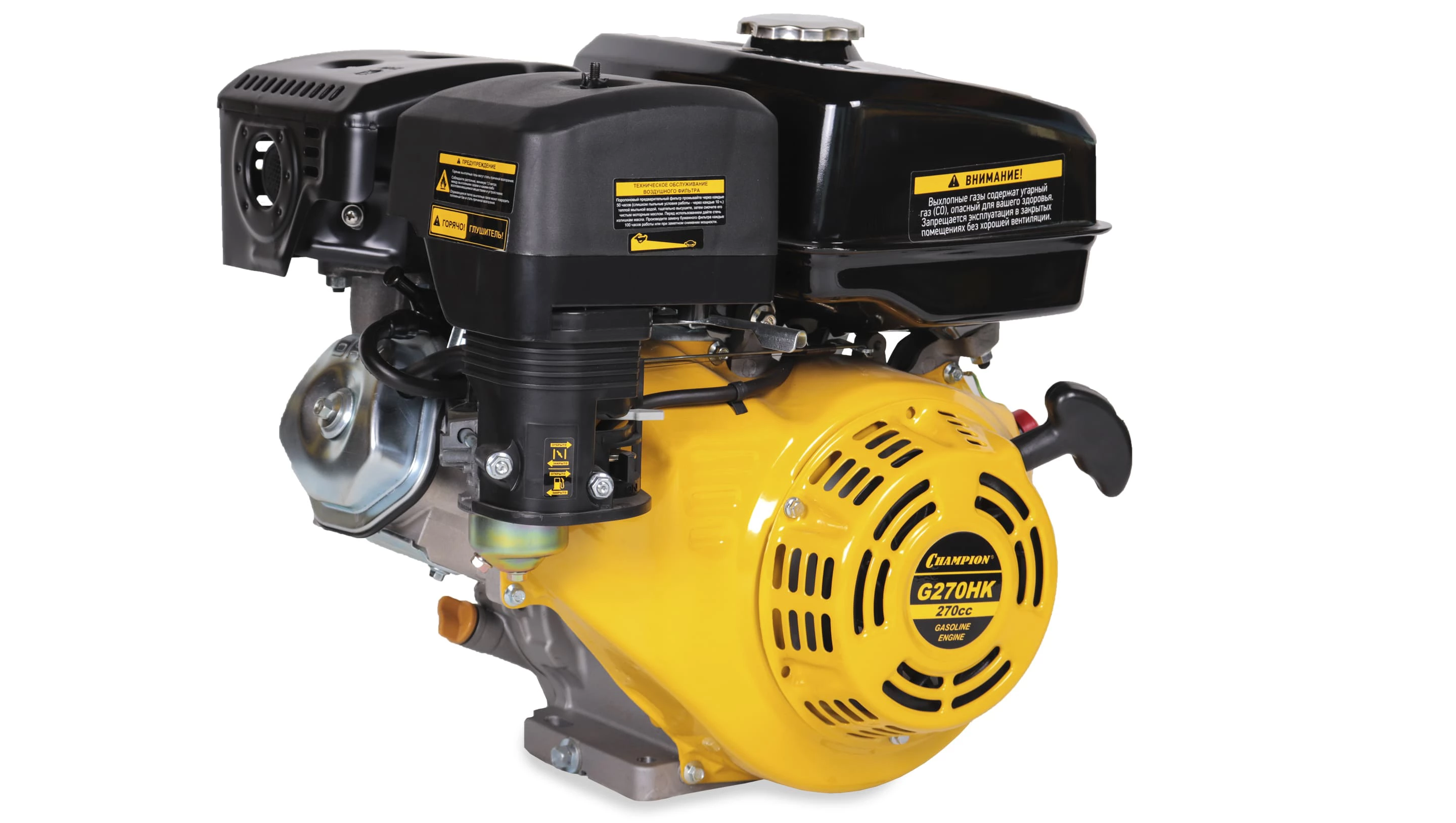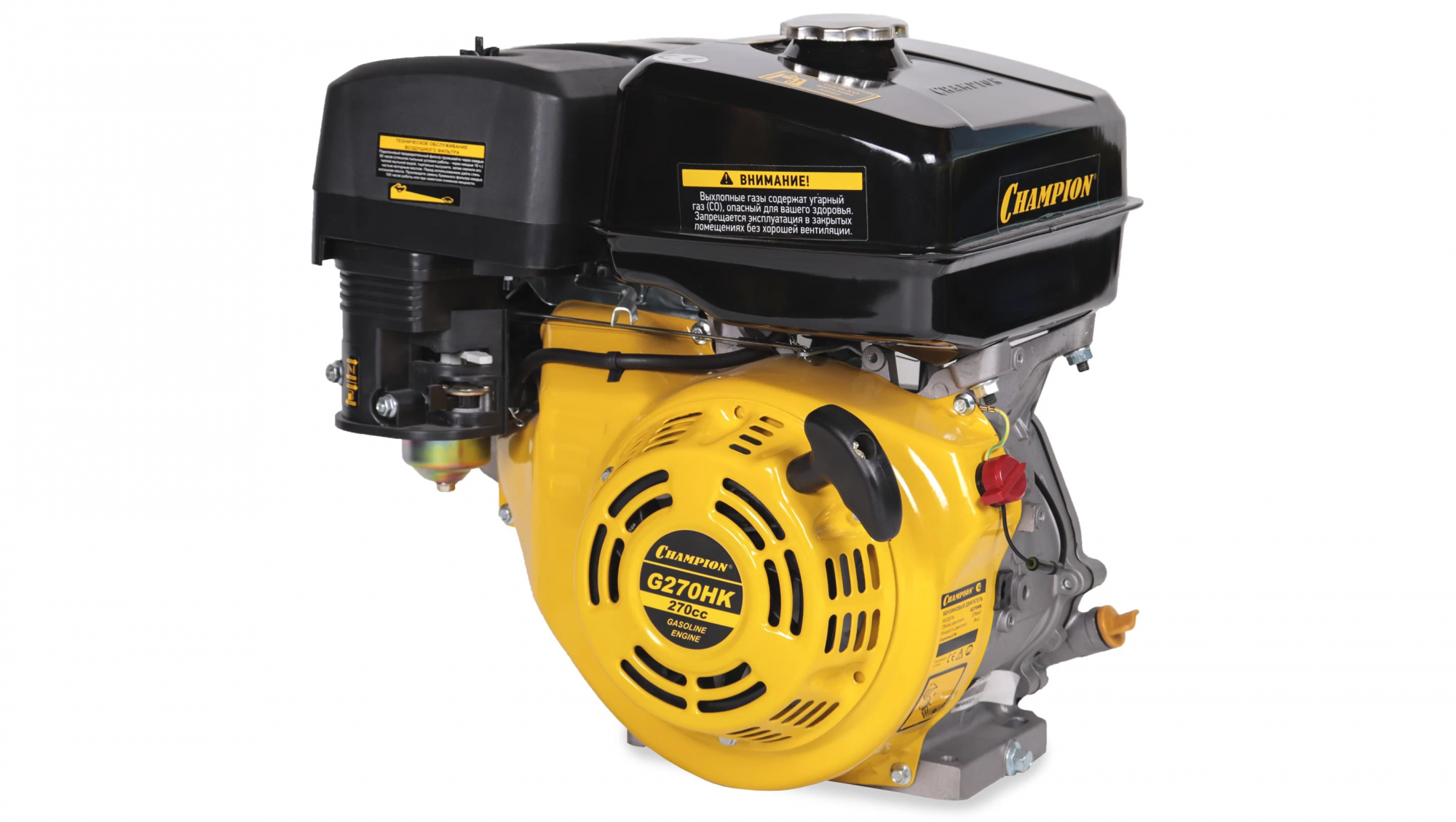 Бензиновый двигатель Champion G270HK применяется на любительской и профессиональной малой сельскохозяйственной технике и подобного оборудования — мотоблоков, газонокосилок, культиваторов, снегоуборщиков, агрегатов для перекачки воды или перемалывания круп. Мощности двигателя с горизонтальным расположением вала достаточно для решения большинства задач на огороде, в поле или на хозяйственном дворе в сжатые сроки. Двигатель Champion G270HK отличается конструкцией, благодаря которой даже при большой нагрузке он долгое время не перегревается, позволяя полностью использовать свои возможности. Корпус модели выполнен из алюминиевого сплава, этот материал быстро отводит тепло, поэтому двигатель Champion G270HK превосходно работает даже в жаркую погоду, имея всего лишь простую воздушную систему охлаждения. Разработчикам удалось создать производительную модель в компактном корпусе, благодаря чему двигатель Champion G270HK легко и без проблем устанавливается на шасси. Следует только учесть расположение вала и его размер, данная модель подходит для агрегатов, предназначенных для подсоединения горизонтального вала. За счет качественного и точного исполнения всех деталей и узлов, а также продуманной конструкции модель характеризуется хорошим балансом, она не трясется и не вибрирует ни на больших, ни на малых оборотах, что не только увеличивает срок службы, но и снижает расход топлива. Хорошо отрегулированное зажигание и клапана, а также эффективный глушитель снизили уровень шума до показателей, комфортных для оператора и окружающих людей. Комплектация модели включает все необходимое для установки, в частности имеется понятная информативная инструкция на русском языке, а также требования по обслуживанию этого двигателя внутреннего сгорания.
