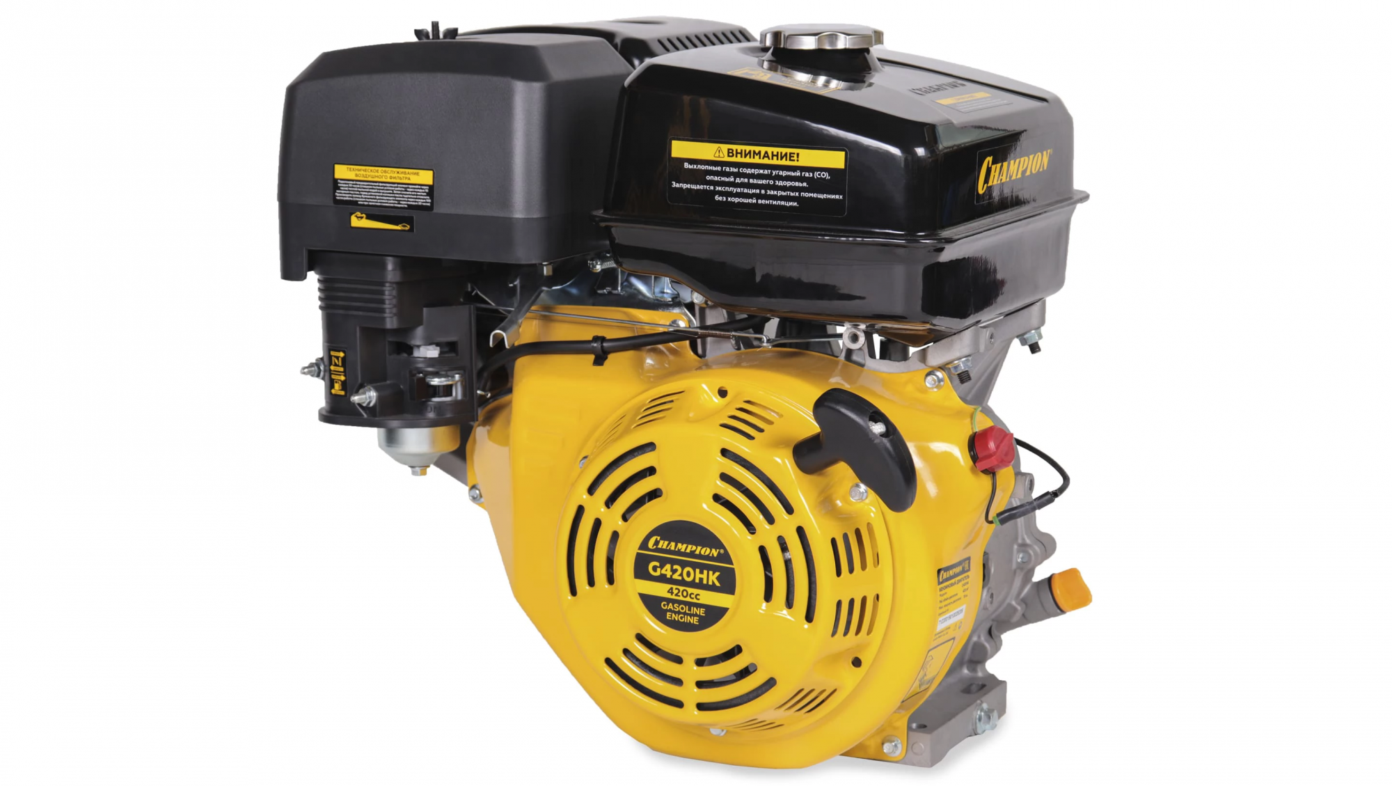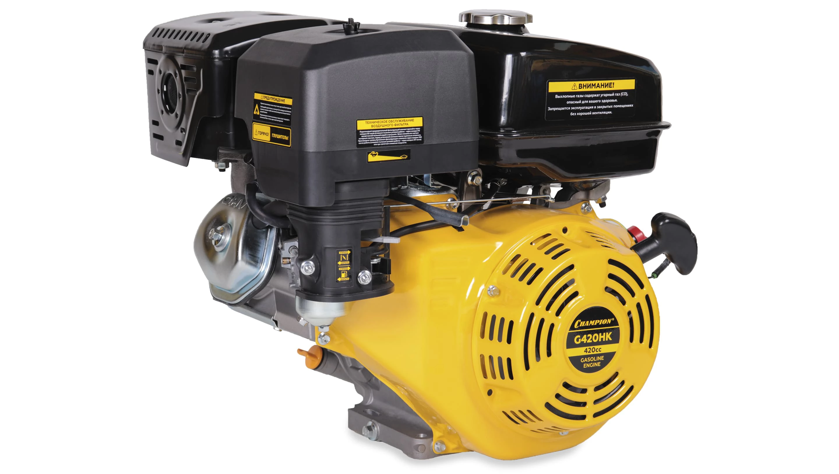 Бензиновый двигатель Champion G420HK применяется на любительской и профессиональной малой сельскохозяйственной технике и подобного оборудования — мотоблоков, газонокосилок, культиваторов, снегоуборщиков, агрегатов для перекачки воды или перемалывания круп. Мощности двигателя с горизонтальным расположением вала достаточно для решения большинства задач на огороде, в поле или на хозяйственном дворе в сжатые сроки. Двигатель Champion G420HK отличается конструкцией, благодаря которой даже при большой нагрузке он долгое время не перегревается, позволяя полностью использовать свои возможности. Корпус модели выполнен из алюминиевого сплава, этот материал быстро отводит тепло, поэтому двигатель Champion G420HK превосходно работает даже в жаркую погоду, имея всего лишь простую воздушную систему охлаждения. Разработчикам удалось создать производительную модель в компактном корпусе, благодаря чему двигатель Champion G420HK легко и без проблем устанавливается на шасси. Следует только учесть расположение вала и его размер, данная модель подходит для агрегатов, предназначенных для подсоединения горизонтального вала. За счет качественного и точного исполнения всех деталей и узлов, а также продуманной конструкции модель характеризуется хорошим балансом, она не трясется и не вибрирует ни на больших, ни на малых оборотах, что не только увеличивает срок службы, но и снижает расход топлива. Хорошо отрегулированное зажигание и клапана, а также эффективный глушитель снизили уровень шума до показателей, комфортных для оператора и окружающих людей. Комплектация модели включает все необходимое для установки, в частности имеется понятная информативная инструкция на русском языке, а также требования по обслуживанию этого двигателя внутреннего сгорания.
