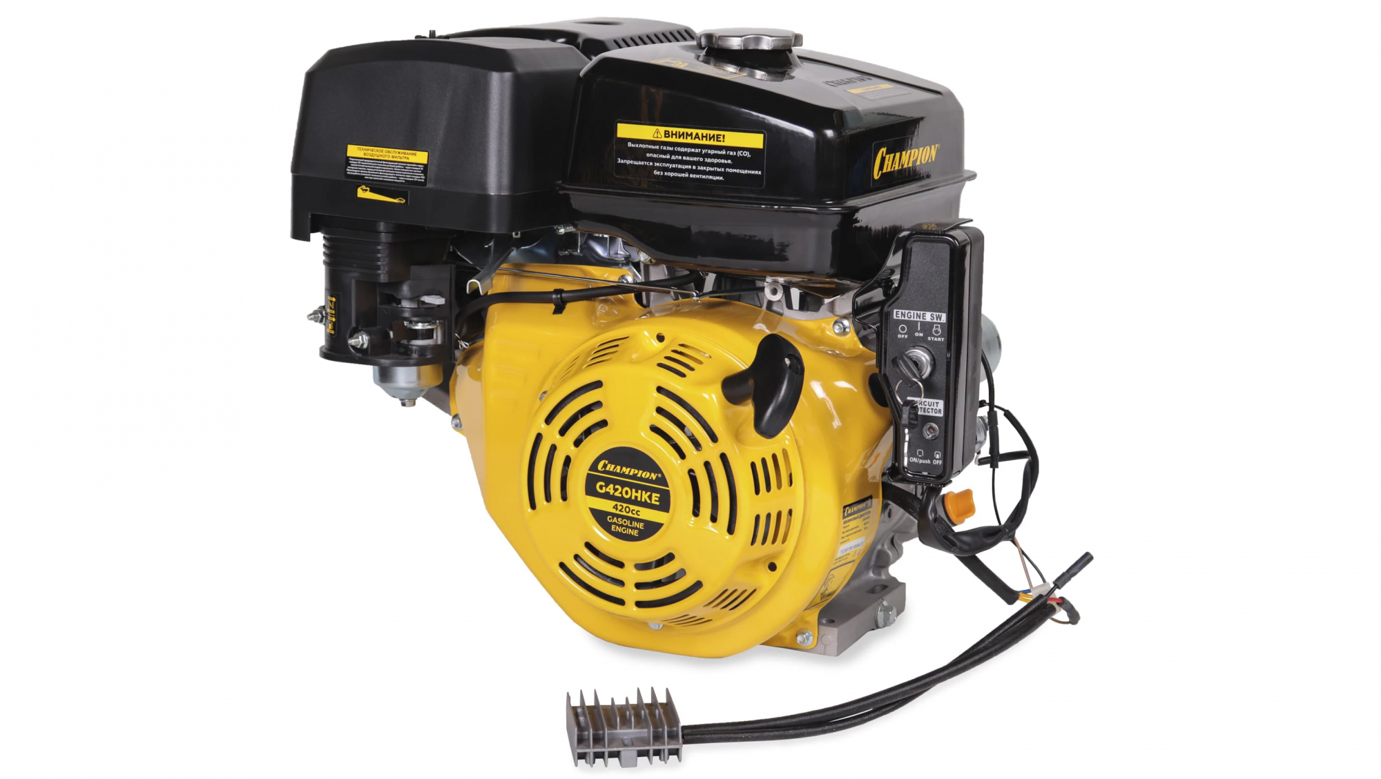 Бензиновый двигатель Champion G420HKE применяется на любительской и профессиональной малой сельскохозяйственной технике и подобного оборудования — мотоблоков, газонокосилок, культиваторов, снегоуборщиков, агрегатов для перекачки воды или перемалывания круп. Мощности двигателя с горизонтальным расположением вала достаточно для решения большинства задач на огороде, в поле или на хозяйственном дворе в сжатые сроки. Двигатель Champion G420HKE отличается конструкцией, благодаря которой даже при большой нагрузке он долгое время не перегревается, позволяя полностью использовать свои возможности. Корпус модели выполнен из алюминиевого сплава, этот материал быстро отводит тепло, поэтому двигатель Champion G420HKE превосходно работает даже в жаркую погоду, имея всего лишь простую воздушную систему охлаждения. Разработчикам удалось создать производительную модель в компактном корпусе, благодаря чему двигатель Champion G420HKE легко и без проблем устанавливается на шасси. Следует только учесть расположение вала и его размер, данная модель подходит для агрегатов, предназначенных для подсоединения горизонтального вала. За счет качественного и точного исполнения всех деталей и узлов, а также продуманной конструкции модель характеризуется хорошим балансом, она не трясется и не вибрирует ни на больших, ни на малых оборотах, что не только увеличивает срок службы, но и снижает расход топлива. Хорошо отрегулированное зажигание и клапана, а также эффективный глушитель снизили уровень шума до показателей, комфортных для оператора и окружающих людей. Комплектация модели включает все необходимое для установки, в частности имеется понятная информативная инструкция на русском языке, а также требования по обслуживанию этого двигателя внутреннего сгорания.