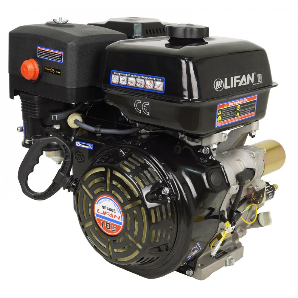 Бензиновый двигатель Lifan NP460E (диметр вала 25 мм) 18,5 л.с. с электростартером и катушкой освещения 18A сочетает в себе долговечность, экономичность с умеренной стоимостью и простотой в использовании.