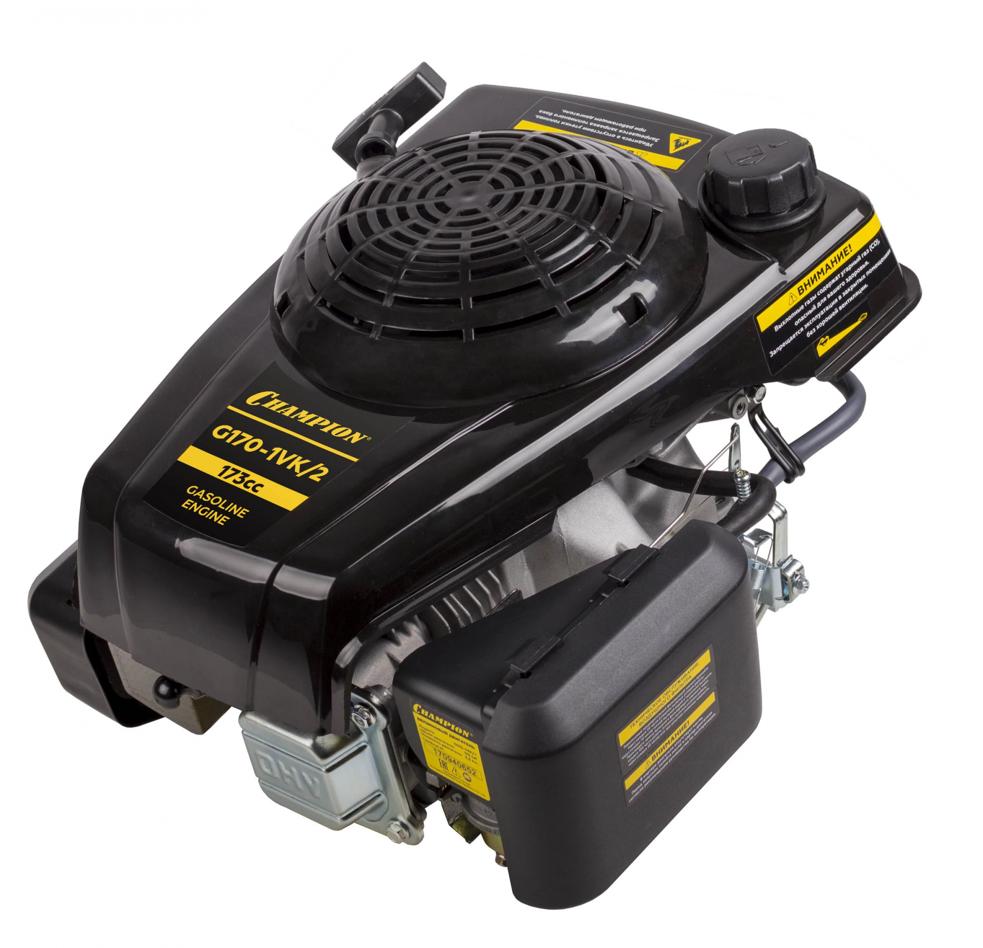 Бензиновый двигатель Champion G170-1VK/2 применяется на любительской и профессиональной малой сельскохозяйственной технике и подобного оборудования — мотоблоков, газонокосилок, культиваторов, снегоуборщиков, агрегатов для перекачки воды или перемалывания круп. Мощности двигателя с вертикальным расположением вала достаточно для решения большинства задач на огороде, в поле или на хозяйственном дворе в сжатые сроки. Двигатель Champion G170-1VK/2 отличается конструкцией, благодаря которой даже при большой нагрузке он долгое время не перегревается, позволяя полностью использовать свои возможности. Корпус модели выполнен из алюминиевого сплава, этот материал быстро отводит тепло, поэтому двигатель Champion G170-1VK/2 превосходно работает даже в жаркую погоду, имея всего лишь простую воздушную систему охлаждения. Разработчикам удалось создать производительную модель в компактном корпусе, благодаря чему двигатель Champion G170-1VK/2 легко и без проблем устанавливается на шасси. Следует только учесть расположение вала и его размер, данная модель подходит для агрегатов, предназначенных для подсоединения вертикального вала. За счет качественного и точного исполнения всех деталей и узлов, а также продуманной конструкции модель характеризуется хорошим балансом, она не трясется и не вибрирует ни на больших, ни на малых оборотах, что не только увеличивает срок службы, но и снижает расход топлива. Хорошо отрегулированное зажигание и клапана, а также эффективный глушитель снизили уровень шума до показателей, комфортных для оператора и окружающих людей. Комплектация модели включает все необходимое для установки, в частности имеется понятная информативная инструкция на русском языке, а также требования по обслуживанию этого двигателя внутреннего сгорания.