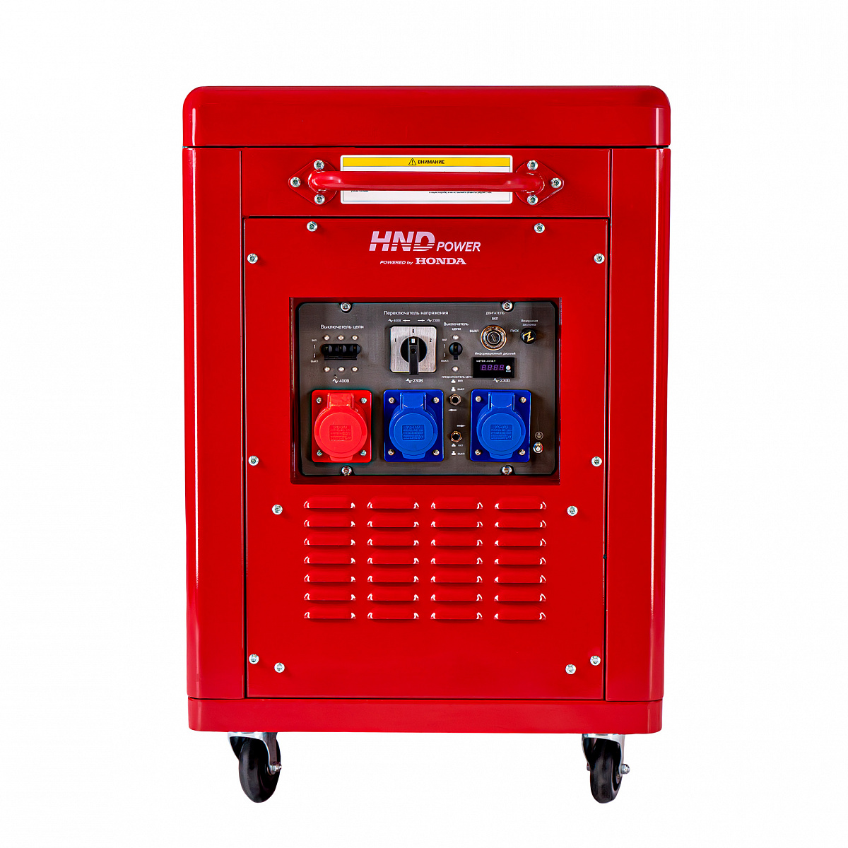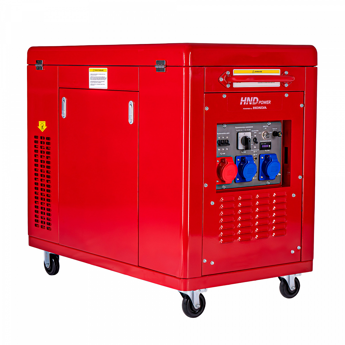 Генератор может служить источником питания для приборов, работающих от сети 230 и 400 вольт. Двигатель генератора – это четырехтактный, двухцилиндровый Honda GX690, отвечающий высоким стандартам надежности, производительности и технологичности.