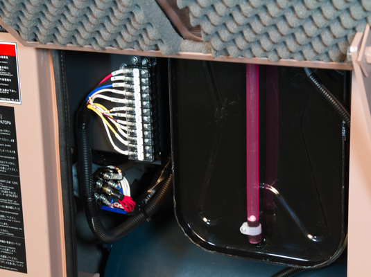 Все электростанции Toyo имеют практичную и удобную панель управления. На панели управления справа есть защищенный терминал подключения кабелей нагрузки с защитным автоматом при перегрузке. Для контроля подключенной нагрузки, в центре есть аналоговые приборы измерения тока и частоты, а также подстроченный потенциометр регулировки выходного напряжения. В правой части приборной панели присутствует аварийная сигнализация защиты двигателя, световые индикаторы давления масла, температура охлаждающей жидкости и работа зарядного генератора АКБ. Под аварийными индикаторами расположен электронный счетчик моточасов наработки электростанции, индикатор работы свечей предпускового накаливания и пилотную лампу работы альтернатора переменного тока. В самом низу расположена кнопка аварийной остановки и разъем ключа зажигания.