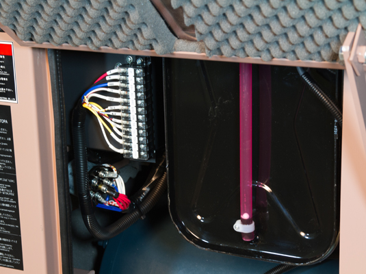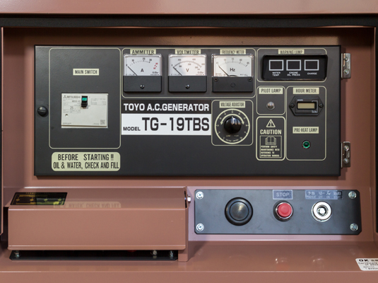 Все электростанции Toyo имеют практичную и удобную панель управления. На панели управления справа есть защищенный терминал подключения кабелей нагрузки с защитным автоматом при перегрузке. Для контроля подключенной нагрузки, в центре есть аналоговые приборы измерения тока и частоты, а также подстроченный потенциометр регулировки выходного напряжения. В правой части приборной панели присутствует аварийная сигнализация защиты двигателя, световые индикаторы давления масла, температура охлаждающей жидкости и работа зарядного генератора АКБ. Под аварийными индикаторами расположен электронный счетчик моточасов наработки электростанции, индикатор работы свечей предпускового накаливания и пилотную лампу работы альтернатора переменного тока. В самом низу расположена кнопка аварийной остановки и разъем ключа зажигания.