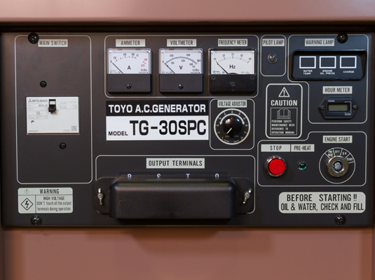 Все электростанции Toyo имеют практичную и удобную панель управления. На панели управления справа есть защищенный терминал подключения кабелей нагрузки с защитным автоматом при перегрузке. Для контроля подключенной нагрузки, в центре есть аналоговые приборы измерения тока и частоты, а также подстроченный потенциометр регулировки выходного напряжения. В правой части приборной панели присутствует аварийная сигнализация защиты двигателя, световые индикаторы давления масла, температура охлаждающей жидкости и работа зарядного генератора АКБ. Под аварийными индикаторами расположен электронный счетчик моточасов наработки электростанции, индикатор работы свечей предпускового накаливания и пилотную лампу работы альтернатора переменного тока. В самом низу расположена кнопка аварийной остановки и разъем ключа зажигания.