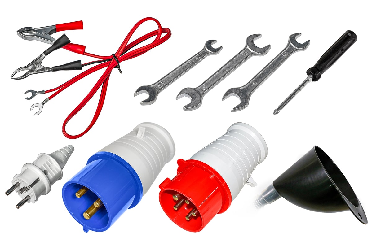 - Набор инструментов в комплекте: отвертка, ключ рожковый 10х12, ключ рожковый 14х17, ключ зажигания (2 шт.)