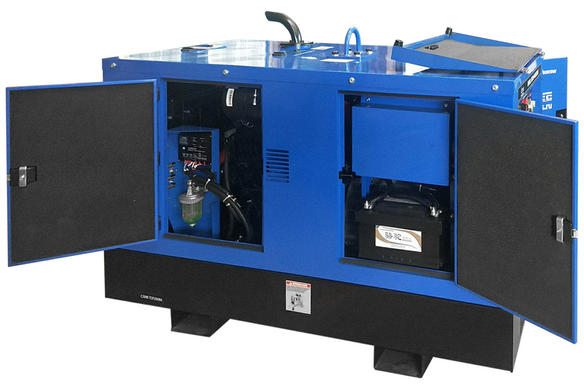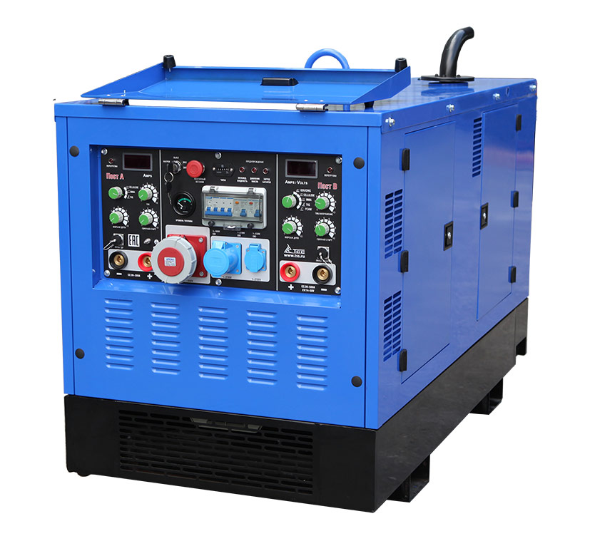 Двухпостовой дизельный сварочный генератор предназначен для организации сварочных работ в полевых условиях, на стройплощадках и в цехах, где нет возможности применить сварочные аппараты, питающиеся от сети переменного тока. Суммарный сварочный ток 600А. Агрегат может использоваться как источник электроэнергии 400В/230В Номинальная выходная мощность генератора 30 кВт.