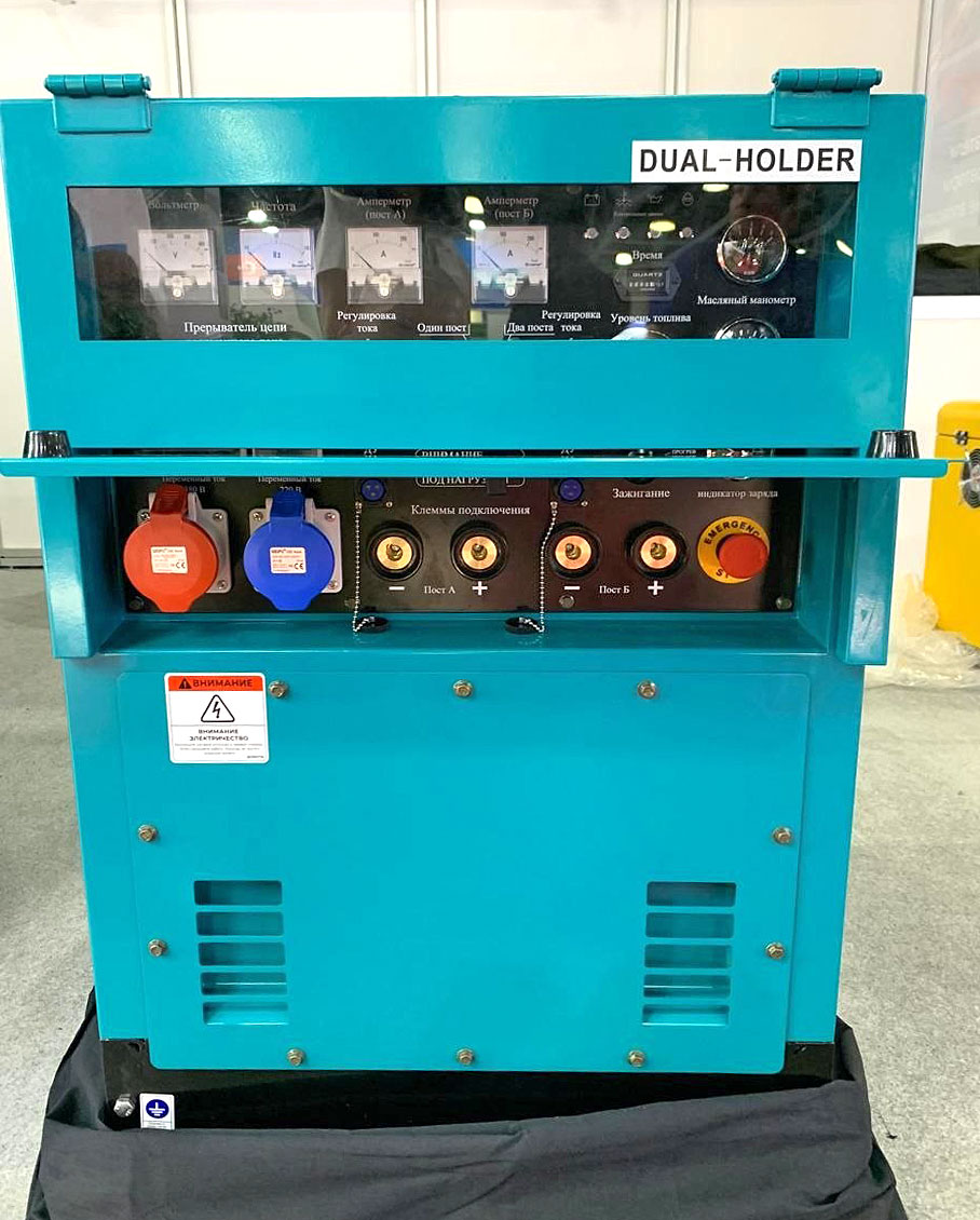 - Интуитивное управление и контроль: на панели управления расположены все необходимые элементы: регулятор сварочного тока, контрольные приборы двигателя, выходные клеммы генератора и сварочных постов.