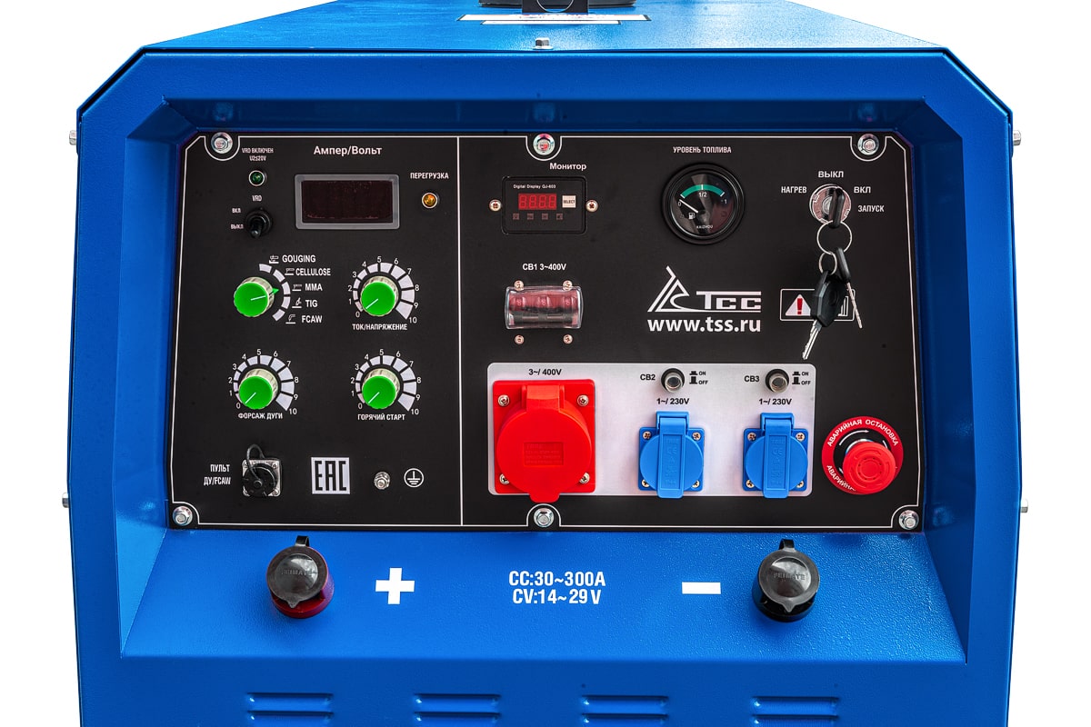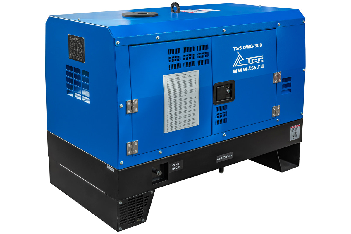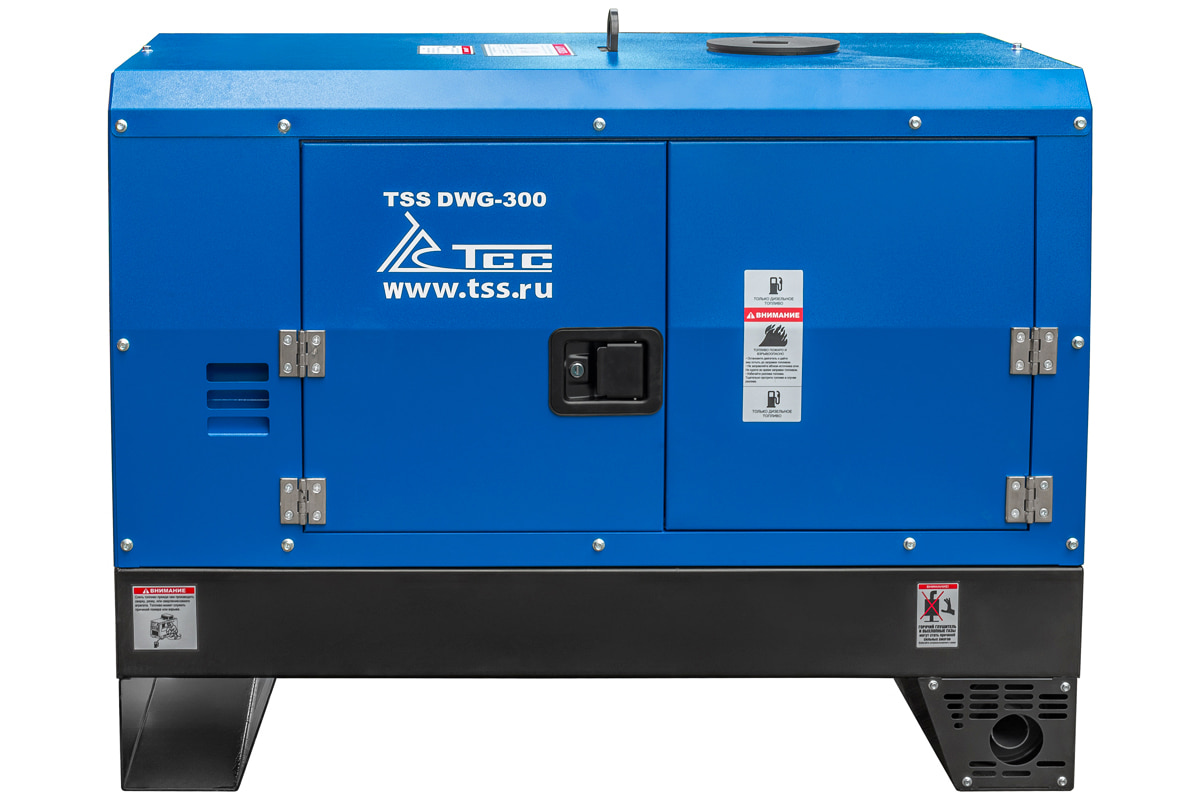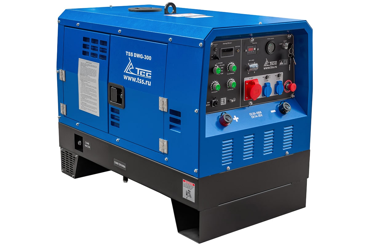 Однопостовой дизельный сварочный генератор TSS DWG-300 предназначен для проведения сварочных работ для одного сварщика. Максимальный сварочный ток при однопостовом режиме работы - 300 А. Агрегат может использоваться как источник электроэнергии 400В/230В. Номинальная выходная мощность генератора 11,2 кВт.
