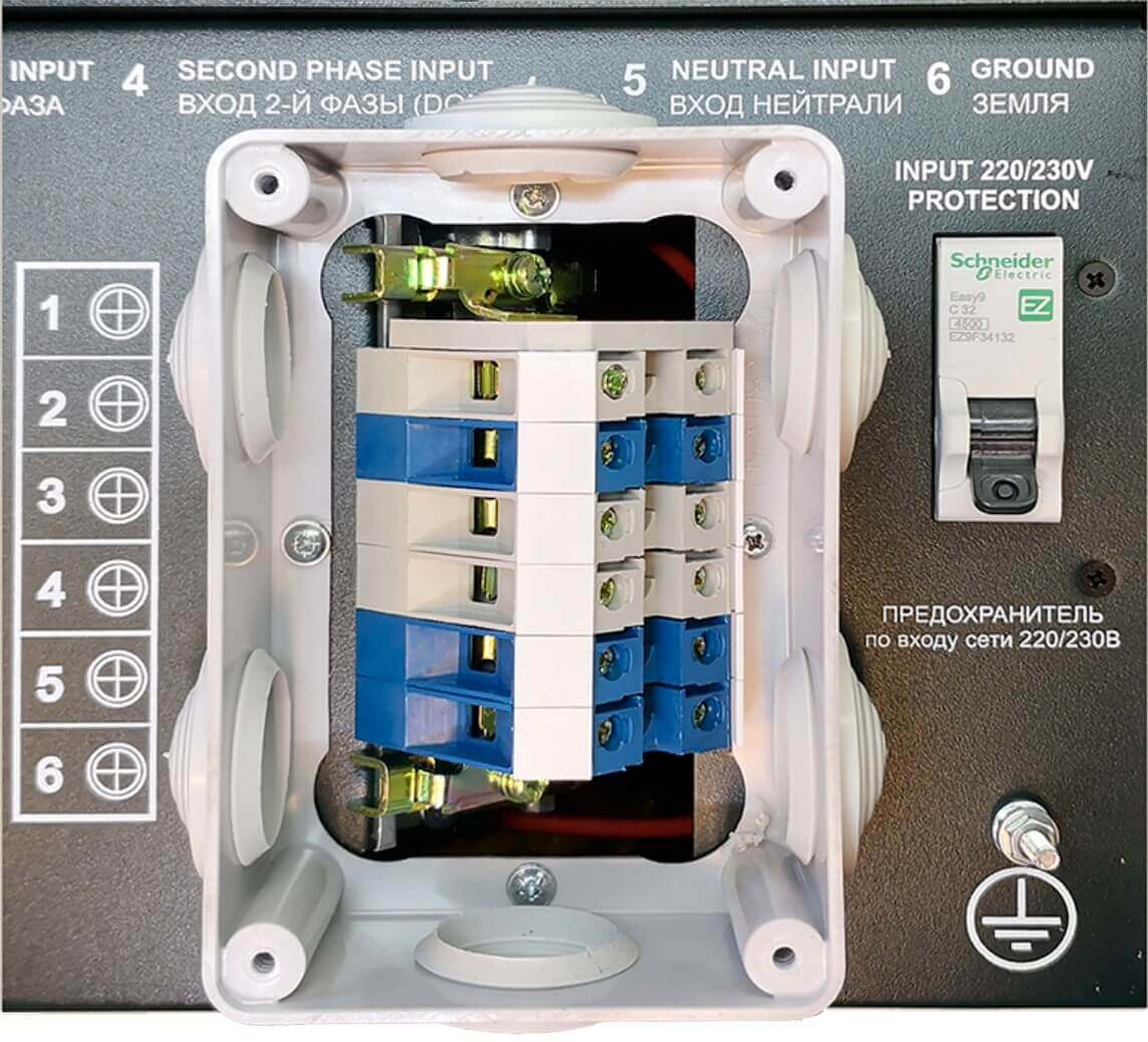 - Два независимых входа питания 220В, позволяющих резервировать питание от внешних источников, будь то разные сетевые вводы, либо ввод и от бензо-дизельгенератора.