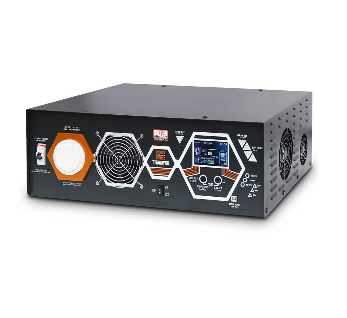 Новая отечественная разработка, гибридно-сетевой инвертор МАП TITANATOR, обладает всеми функциями инвертора МАП DOMINATOR, но имеет и более широкие возможности и расширенные характеристики. МАП TITANATOR — это интеллектуальный центр современной энергетической системы. Усовершенствованная система контроля показателей и быстродействующий цифровой процессор с 12 разрядными АЦП и расширенной периферией. Управляет солнечными панелями, ветрогенератором, а также топливным генератором. Может работать как с солнечным контроллером, так и с сетевым инвертором. Оптимизирует работу электростанции: работает с излишками электроэнергии, может осуществлять подкачку электроэнергии во внутреннюю сеть и продажу в промышленную сеть.