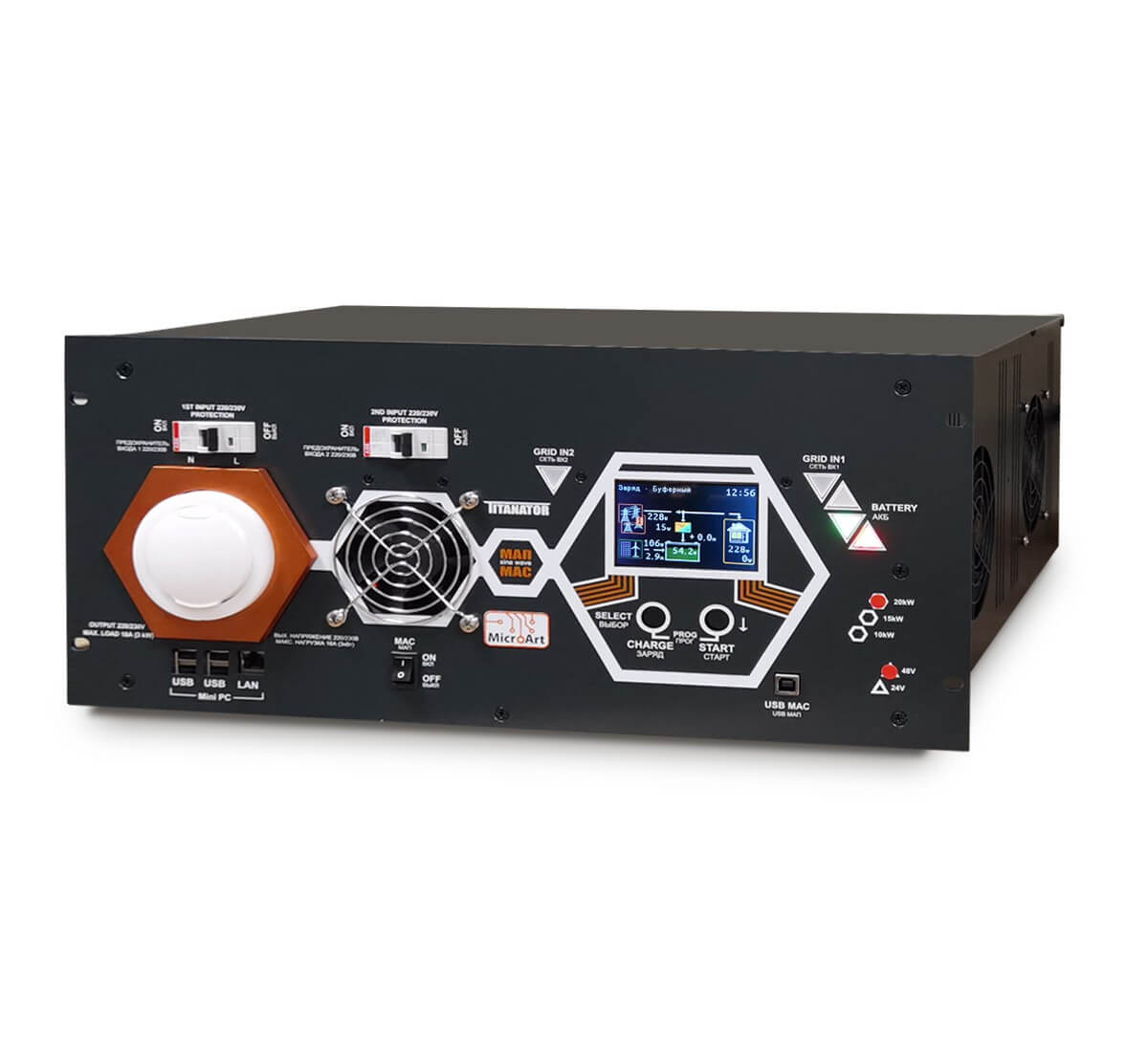 Если нет специальных требований по наличию стандартных выходов 220 В сзади корпуса и по форм-фактору корпуса 19 дюймов, то любой инвертор МАП TITANATOR является полноценным источником бесперебойного питания UPS (ИБП).