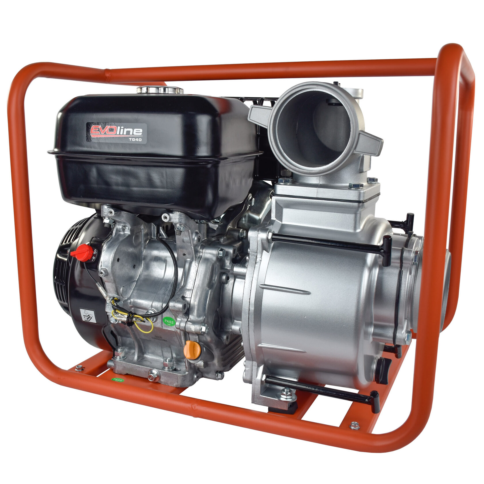 Мотопомпа EVOline TG 40 для перекачки грязной воды с максимальным размером частиц до 28 мм. Данная насос имеет очень высокую производительность в 75 куб.метров в час (1250 л/мин), таких показателей удалось достичь за счет увеличенных диаметров патрубков (100 мм) и мощного двигателя Zongshen GB 420 с максимальной мощностью 15 л.с.