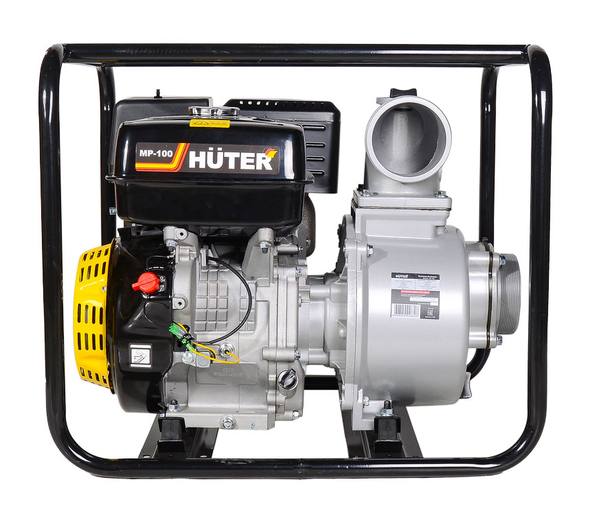 Рабочие узлы размещены в открытом кожухе таким образом, чтобы их удобнее было обслуживать. Мотопомпа Huter MP-100 имеет удобный доступ к насосной части, заливному отверстию и воздушному фильтру двигателя.