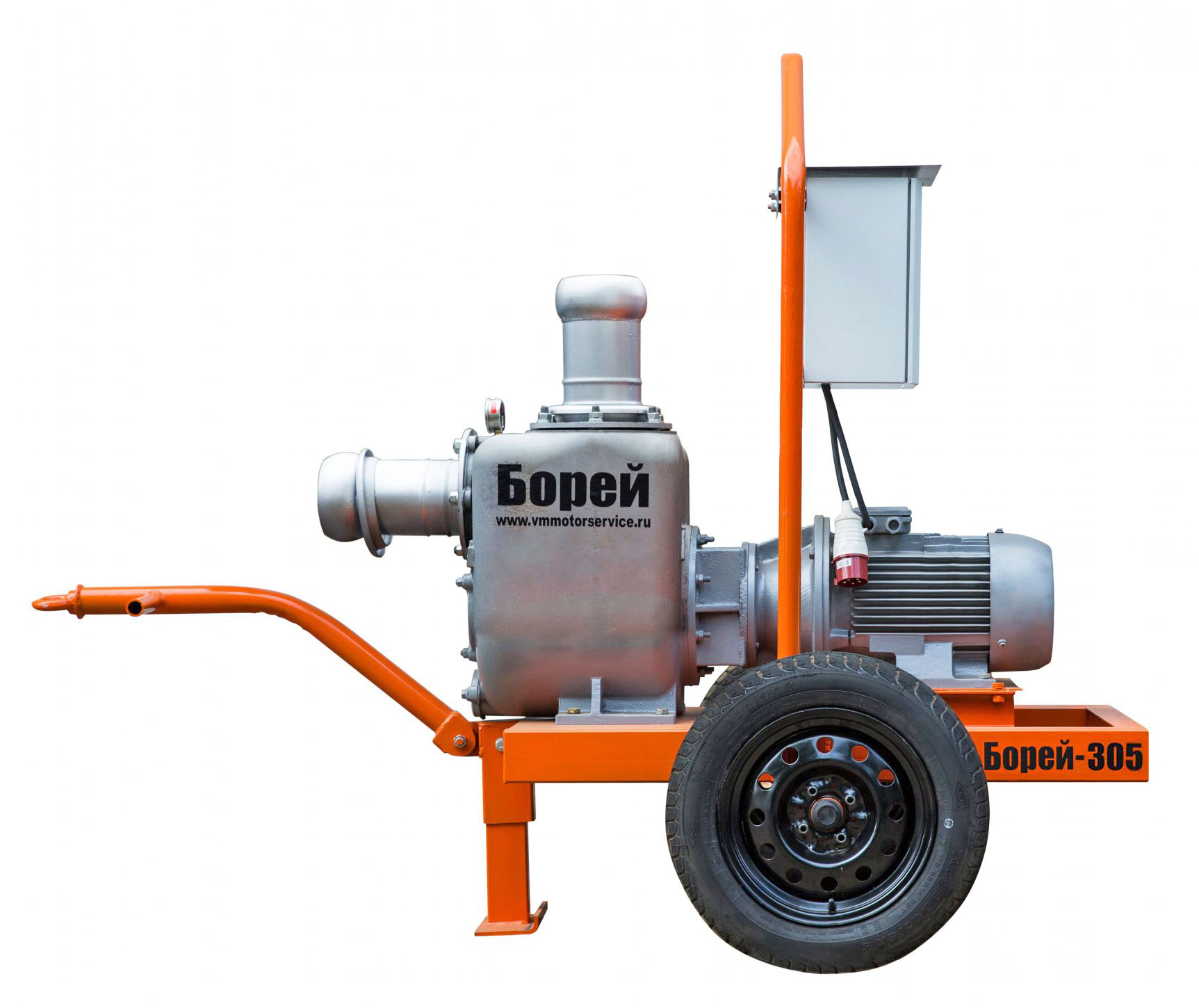 «Борей-305» представляет собой агрегат, который состоит из самовсасывающего центробежного насоса, оснащенного электрическим приводом. Основными деталями центробежного насоса являются корпус, внутри которого вращается рабочее колесо с лопастями. В центр корпуса поступает вода, которая рабочим колесом отбрасывается к ее краям, и оттуда через отверстие центробежная сила выбрасывает ее наружу. Центробежный насос легко перекачивает не только воду с песком или технологическим шламом. Возможности насоса ограничиваются только материалом, из которого он изготовлен, поэтому корпуса и рабочие колеса насосов изготавливаются из износоустойчивого чугуна способного выдержать как широкий диапазон рабочих температур, так и воздействие большинства из перекачиваемых жидкостей.