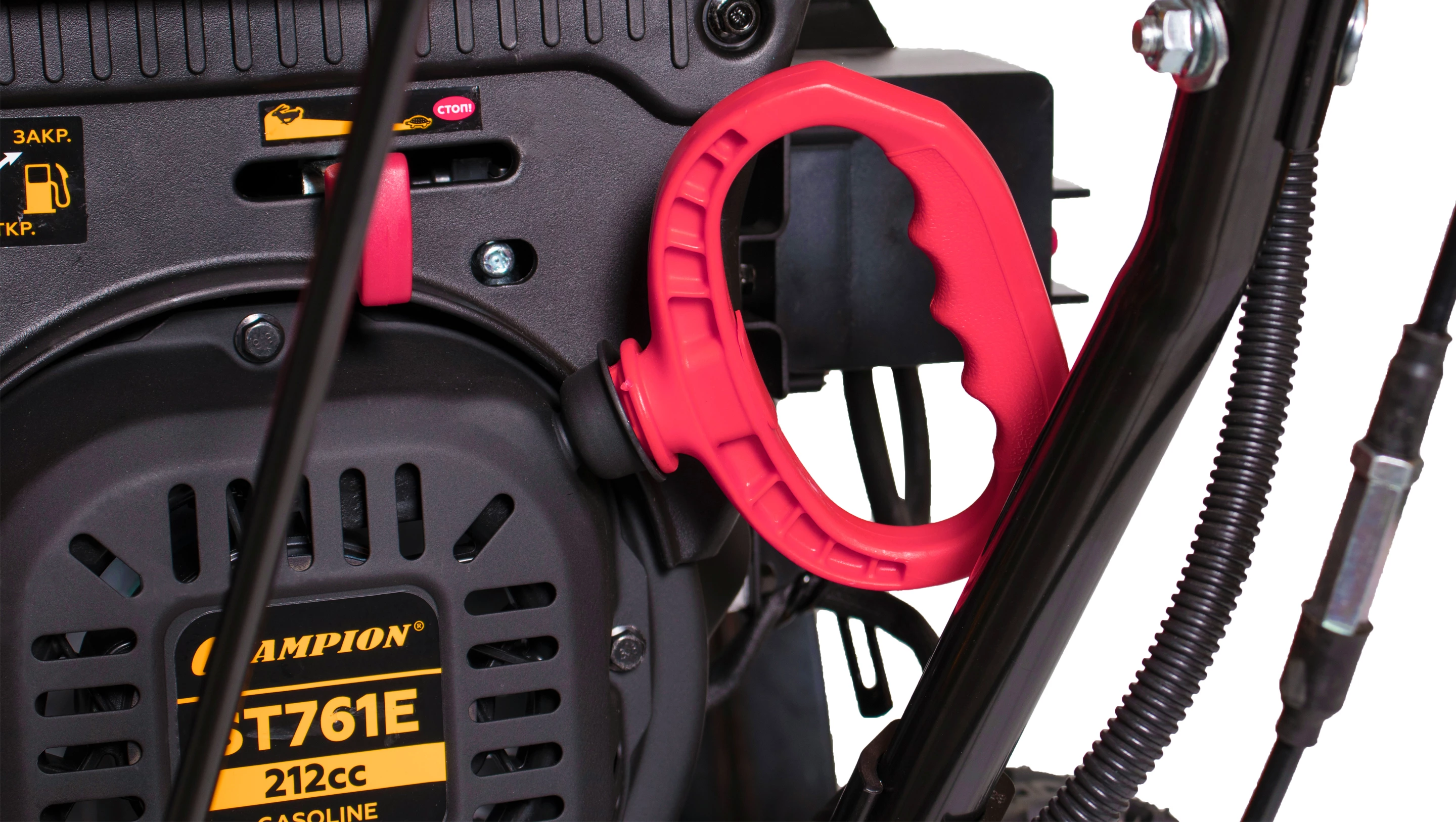 Снегоуборщик оборудован электростартером. Запуск осуществляется простым нажатием кнопки. Запуск можно осуществить, подключив снегоуборщик к электрической розетке 220В в вашем доме, либо вручную при помощи ручки стартера.