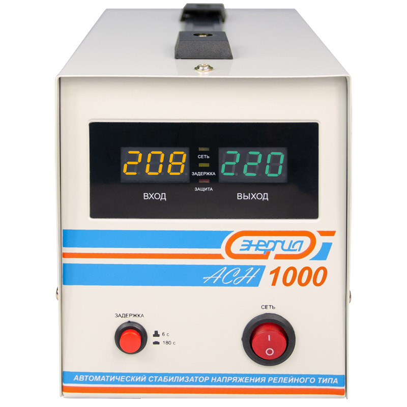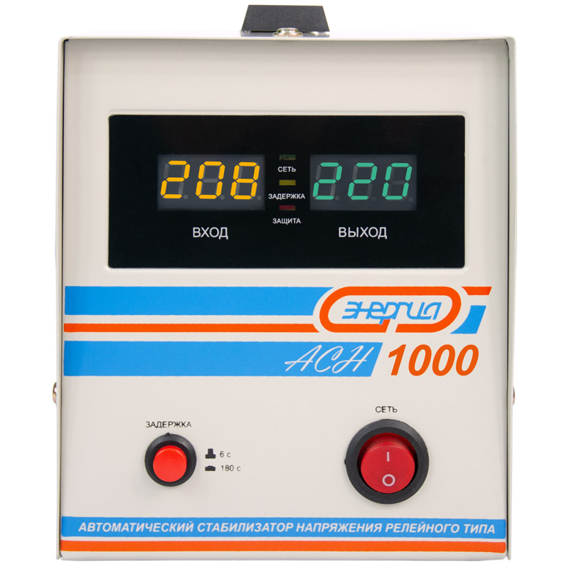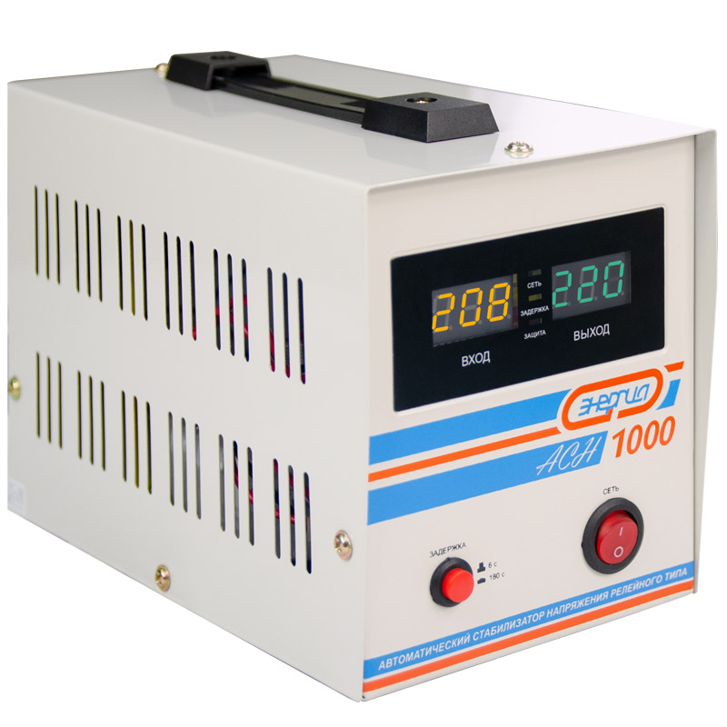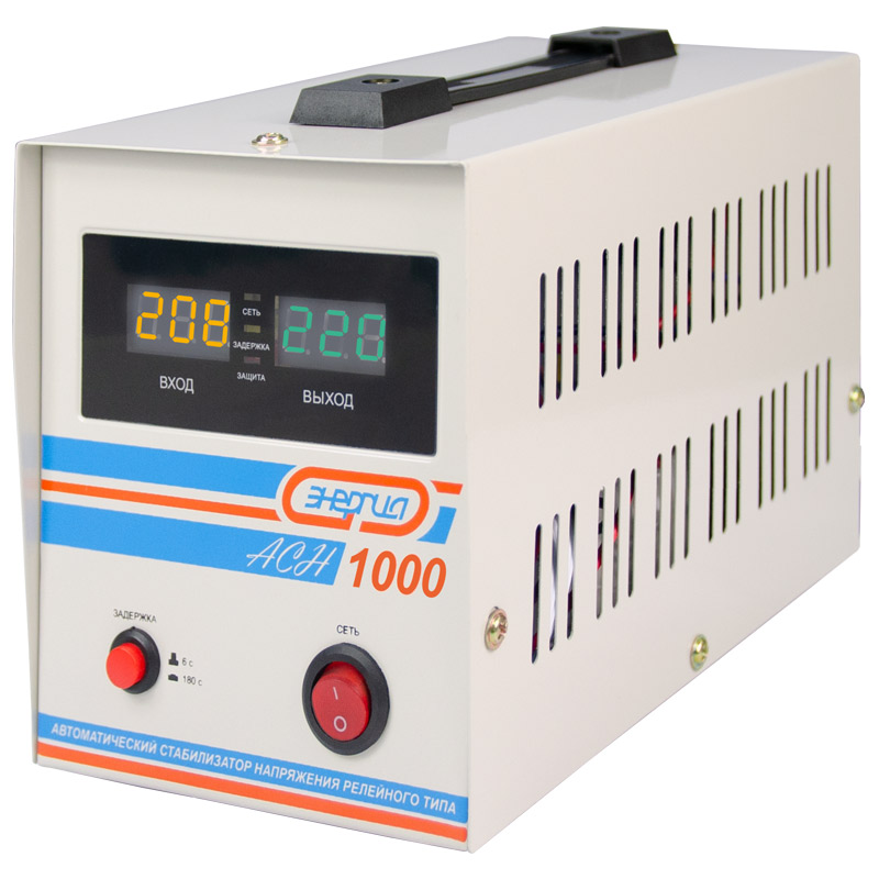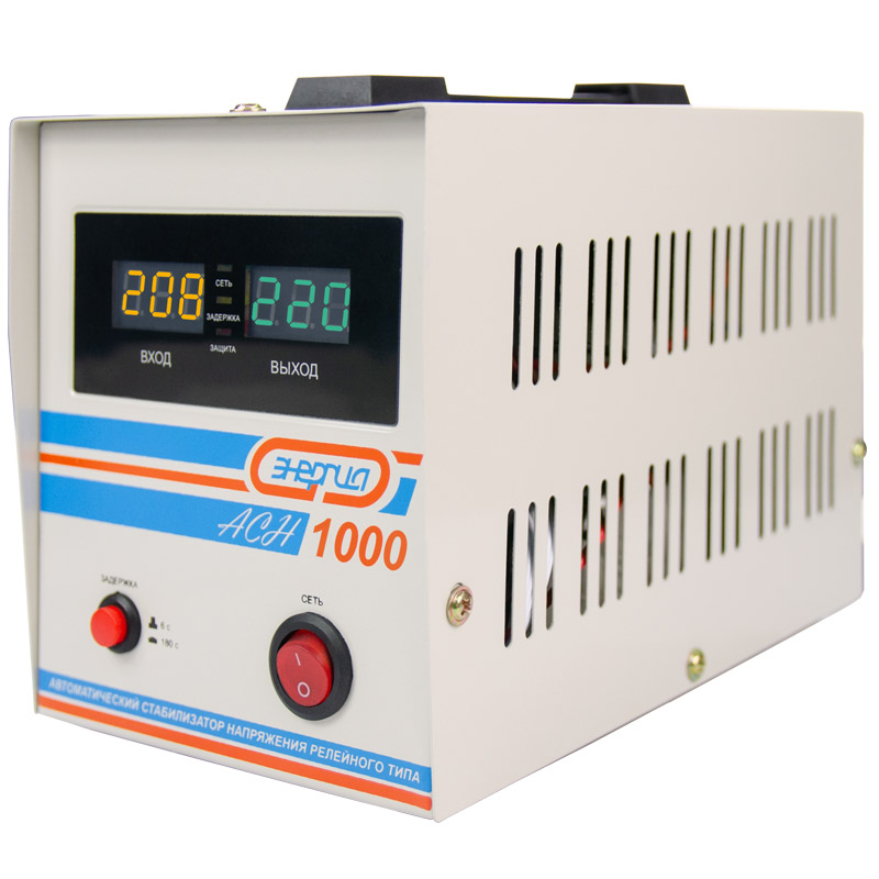Релейный однофазный стабилизатор напряжения переменного тока Энергия АСН 1000 предназначен для стабилизации переменного напряжения в сети электроснабжения для потребителей бытового и аналогичного назначения. Изделие относится к классу автотрансформаторных стабилизаторов со ступенчатым регулированием напряжения путем переключения отводов силового автотрансформатора с помощью электромеханических силовых реле, таким образом стабилизаторы Энергия АСН регулируют напряжение по релейному принципу.