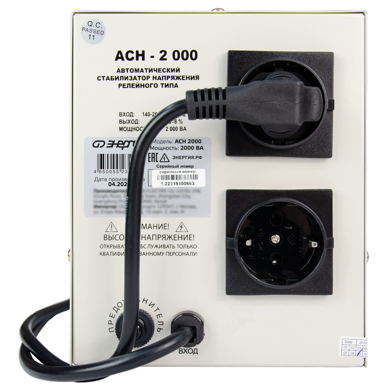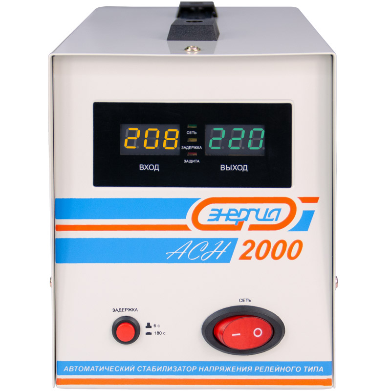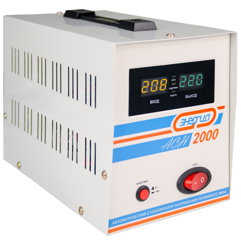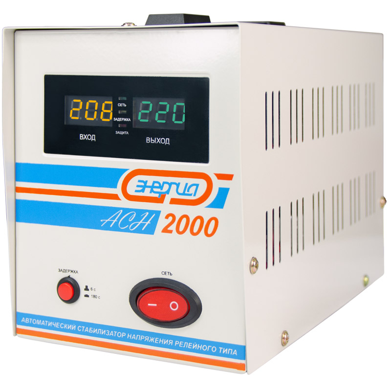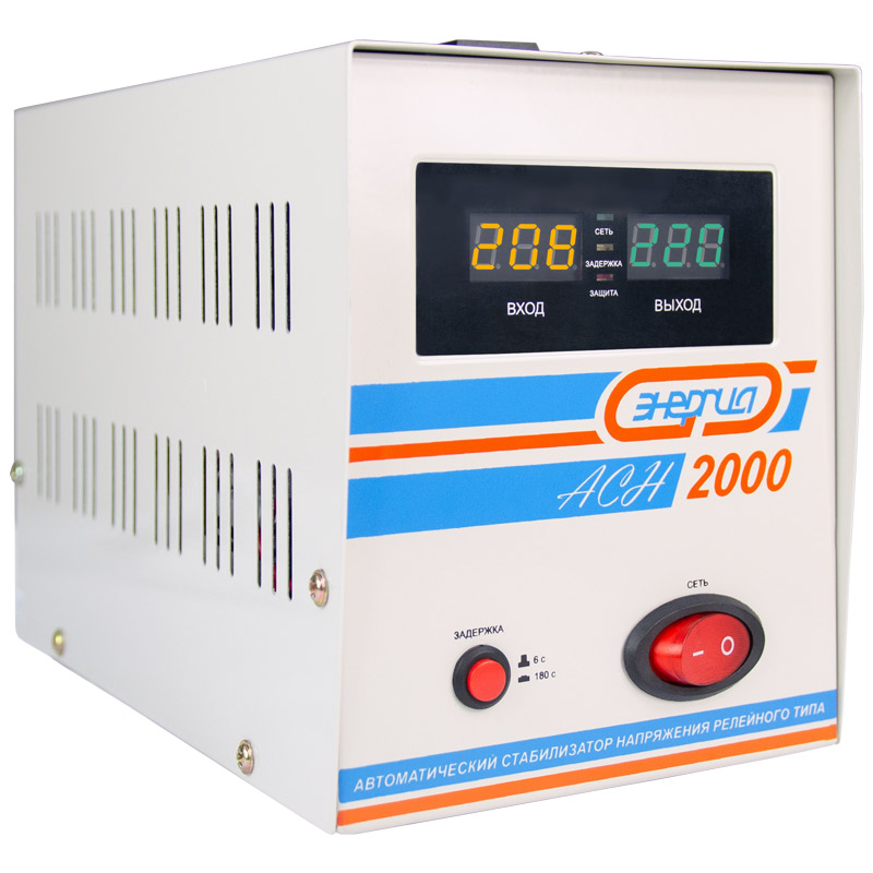 Релейный однофазный стабилизатор напряжения переменного тока Энергия АСН 2000 предназначен для стабилизации переменного напряжения в сети электроснабжения для потребителей бытового и аналогичного назначения. Изделие относится к классу автотрансформаторных стабилизаторов со ступенчатым регулированием напряжения путем переключения отводов силового автотрансформатора с помощью электромеханических силовых реле, таким образом стабилизаторы Энергия АСН регулируют напряжение по релейному принципу.