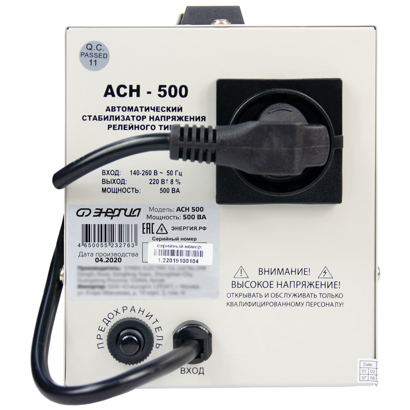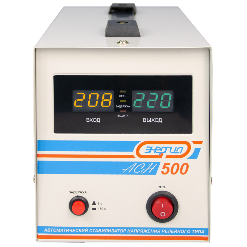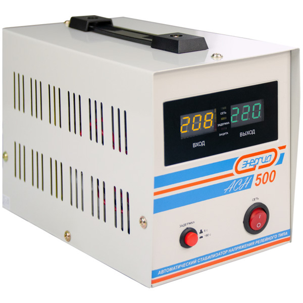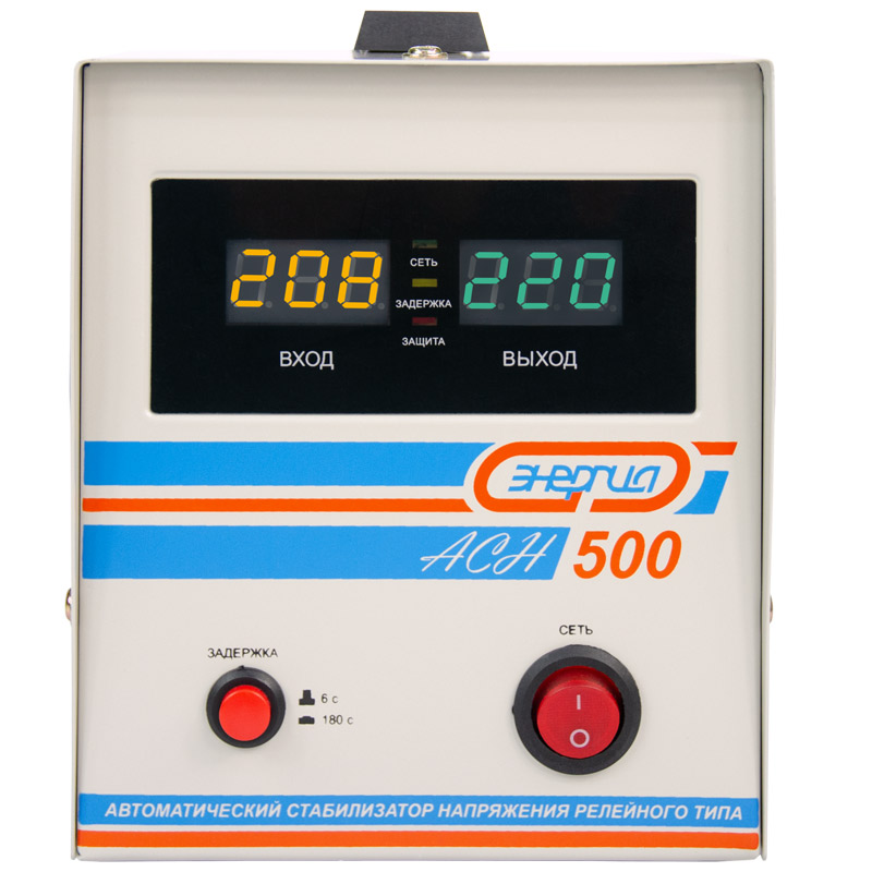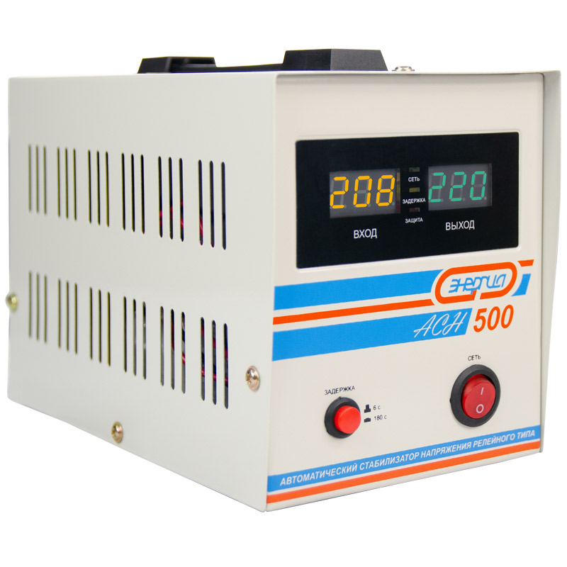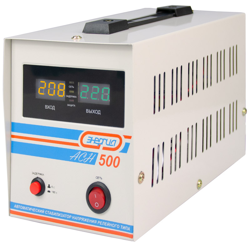 Релейный однофазный стабилизатор напряжения переменного тока Энергия АСН 500 предназначен для стабилизации переменного напряжения в сети электроснабжения для потребителей бытового и аналогичного назначения. Изделие относится к классу автотрансформаторных стабилизаторов со ступенчатым регулированием напряжения путем переключения отводов силового автотрансформатора с помощью электромеханических силовых реле, таким образом стабилизаторы Энергия АСН регулируют напряжение по релейному принципу.