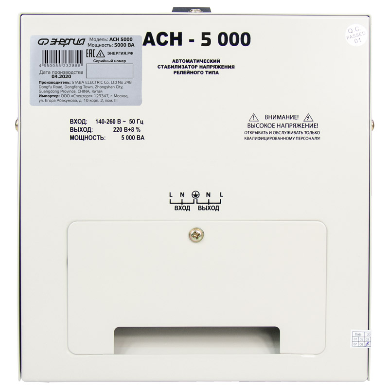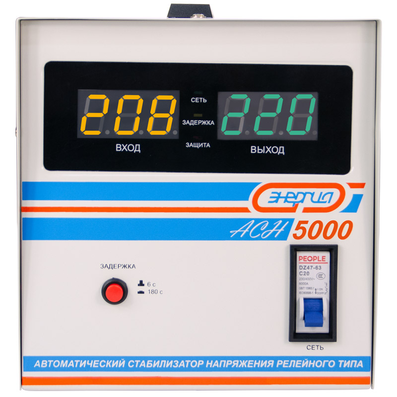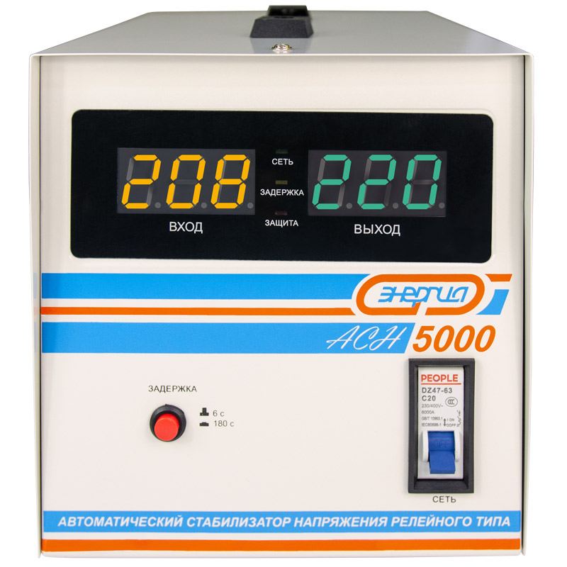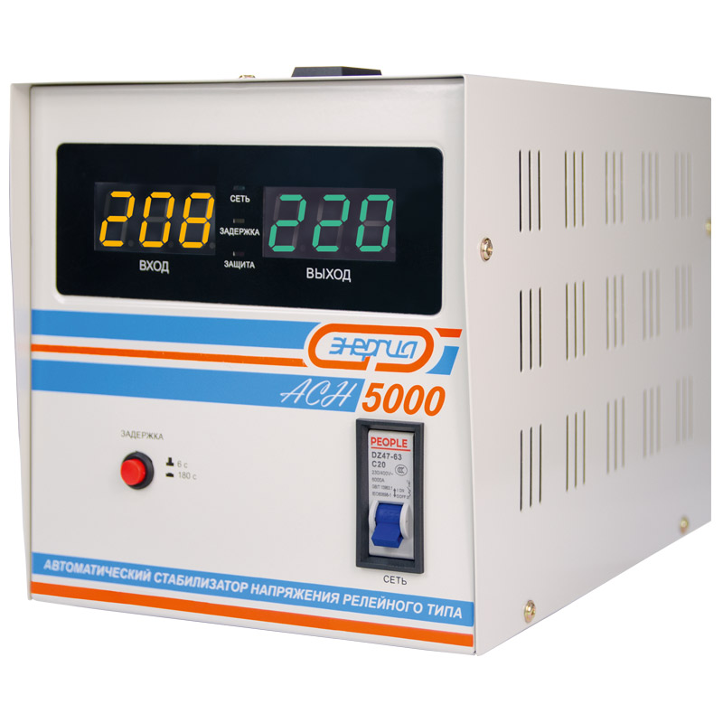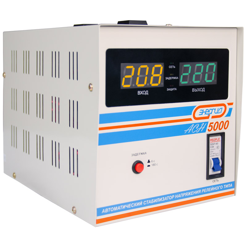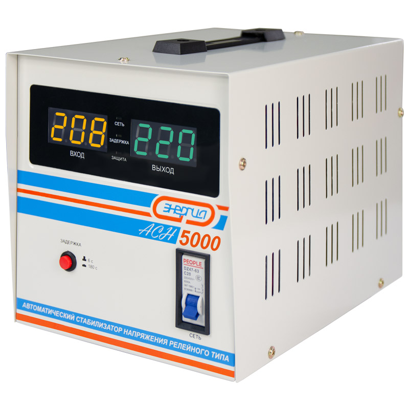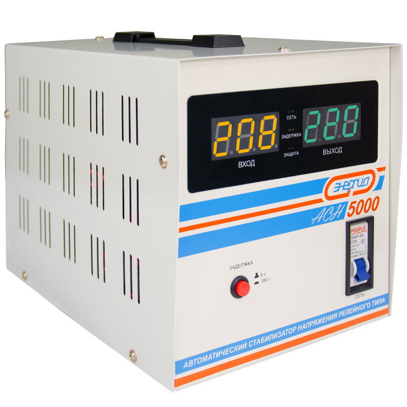 Релейный однофазный стабилизатор напряжения переменного тока Энергия АСН 5000 предназначен для стабилизации переменного напряжения в сети электроснабжения для потребителей бытового и аналогичного назначения. Изделие относится к классу автотрансформаторных стабилизаторов со ступенчатым регулированием напряжения путем переключения отводов силового автотрансформатора с помощью электромеханических силовых реле, таким образом стабилизаторы Энергия АСН регулируют напряжение по релейному принципу.