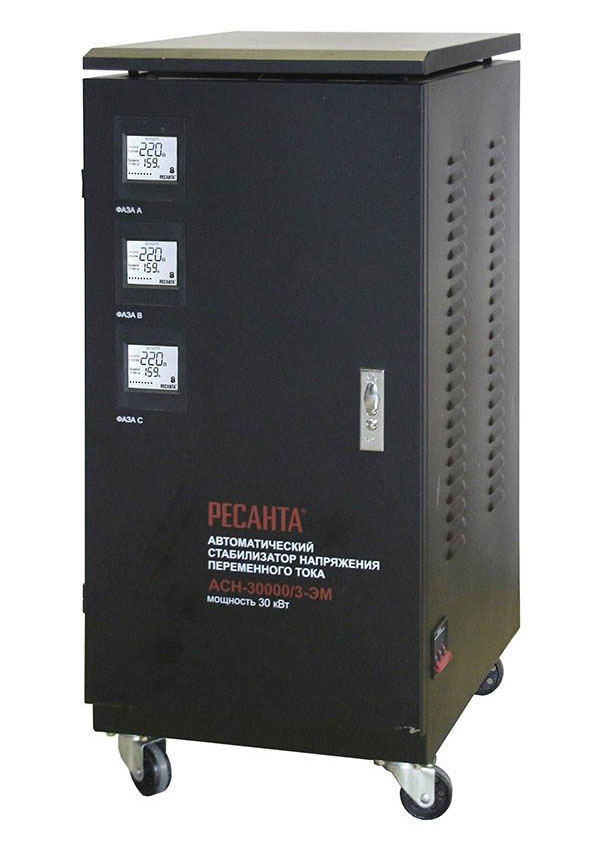 Стабилизатор напряжения РЕСАНТА АСН-30000/3-ЭМ электромеханического типа предназначен для выравнивания входного напряжения и защиты приборов от перепадов напряжения с суммарной мощностью до 30 кВт. Работает с напряжением 380В с точностью до +/-2%. Устройство оснащено фильтрами сетевых помех, предотвращающими искажение частотной синусоиды, микропроцессорным управлением и стрелочной индикацией, отображающей параметры напряжения. Превышение пределов поддерживаемого входного напряжения автоматически отключает подачу питания. Прочный корпус защищает внутренние узлы аппарата от повреждений. Прибор может обеспечивать стабильным питанием частные дома, производственные и офисные здания.