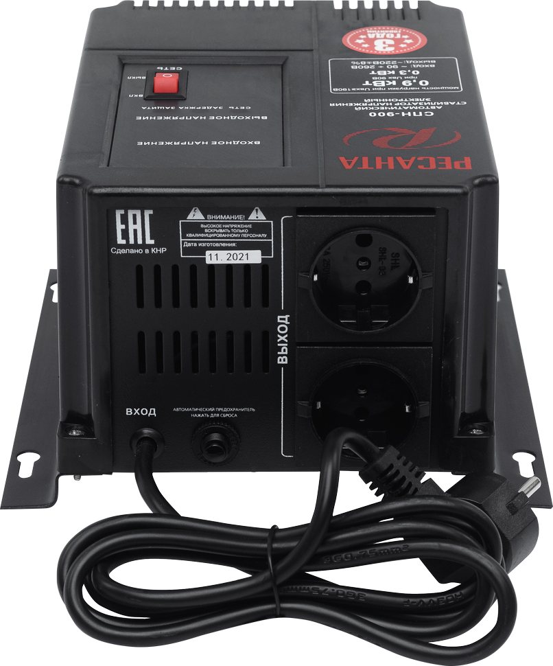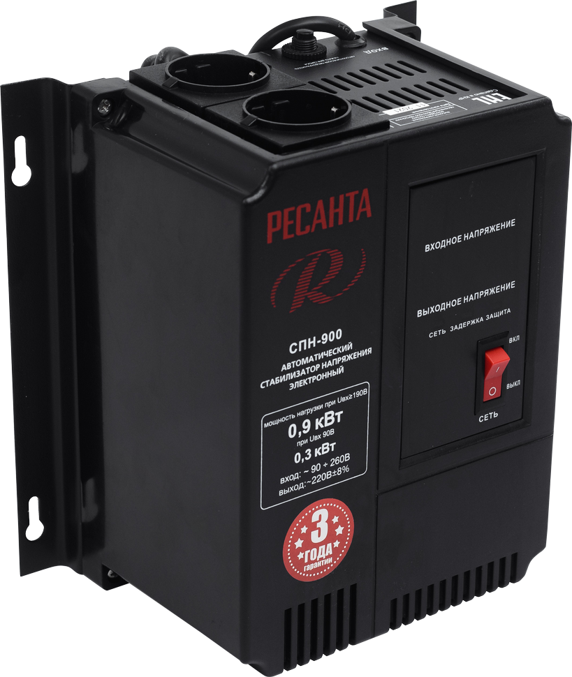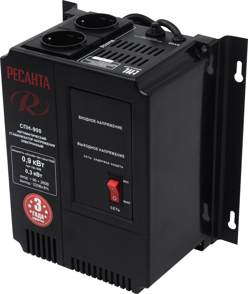 Стабилизатор пониженного напряжения РЕСАНТА СПН-900 предназначен для выравнивания входного напряжения и защиты приборов от перепадов напряжения с суммарной мощностью до 0.9 кВт. Работает с однофазным напряжением 220В с точностью до +/-8%. Устройство оснащено фильтрами сетевых помех, предотвращающими искажение частотной синусоиды, микропроцессорным управлением и цифровым индикатором напряжения. Превышение пределов поддерживаемого входного напряжения автоматически отключает подачу питания. Прочный корпус защищает внутренние узлы аппарата от повреждений. Данный стабилизатор может обеспечивать стабильным питанием - телевизор, ресивер, DVD проигрыватель, кассовый аппарат, газовый котел.