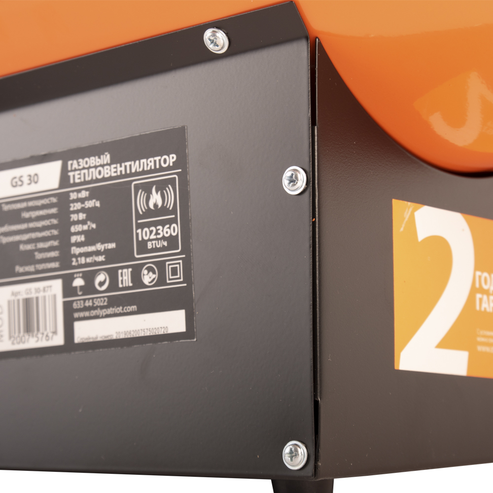 Переносная тепловая пушка Patriot GS 30 на сжиженном газе пропан/бутан. Усовершенствованная горелка с увеличенной подачей кислорода увеличивает КПД и уменьшает выброс в атмосферу отработанных газов. Предназначен как для использования в хорошо проветриваемых помещениях: склады, теплицы, производственные помещения и т.д., так и на открытом пространстве. Газовый шланг 1,5 м и редуктор в комплекте.